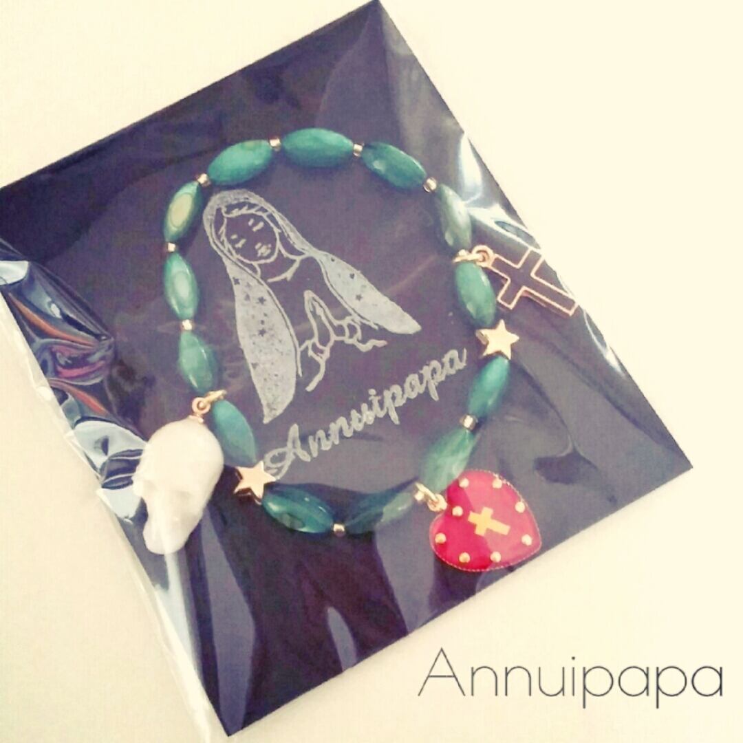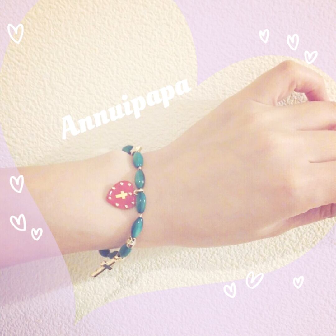 深海の深いブルーのような深海のあるカラーのシェルパーツに、メキシカンな雰囲気のハート・クロス・ドクロパーツがついたカッコいいブレスレットです☆