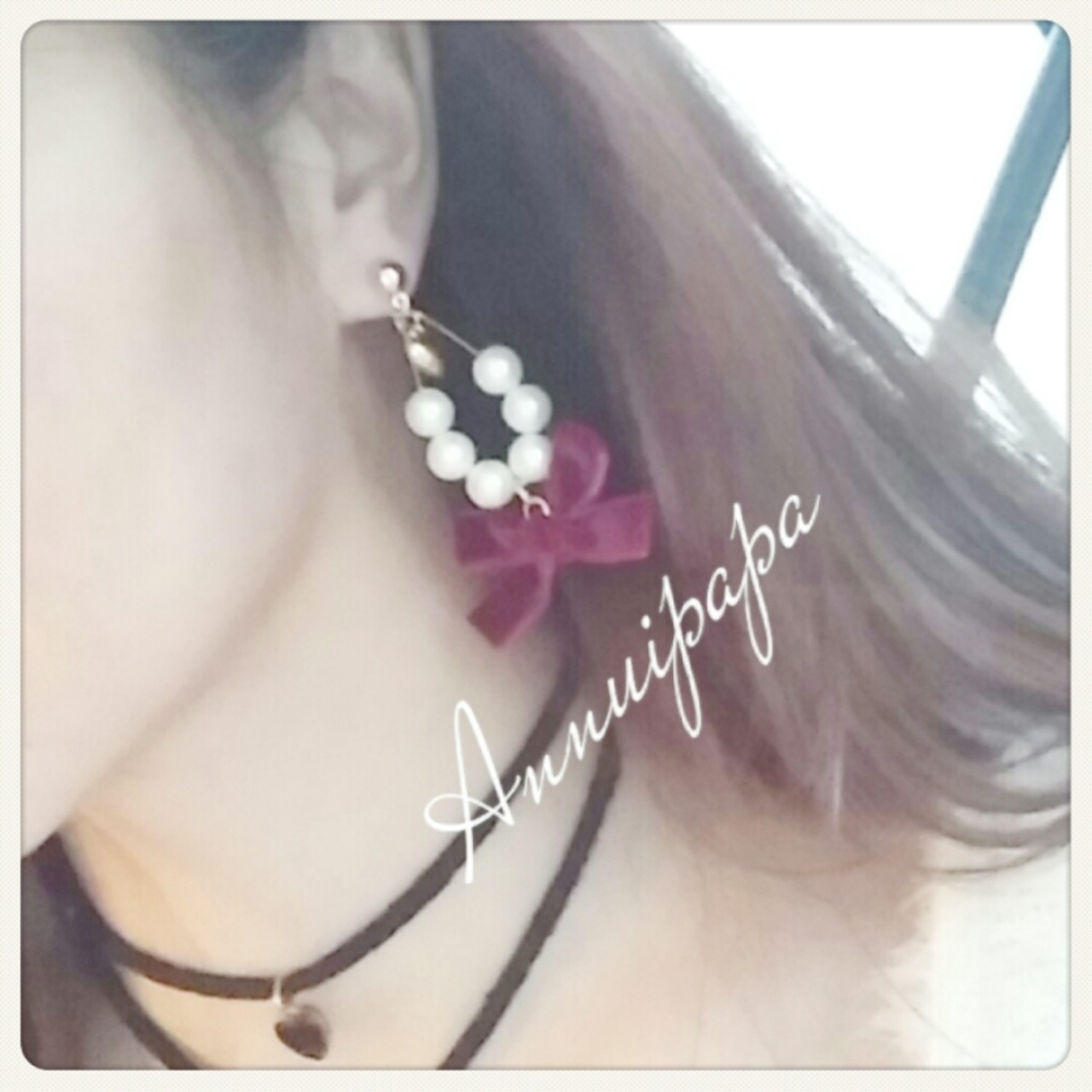 程よいボリューム感の女の子らしいリボンとパールのピアスです(*´ω`*)