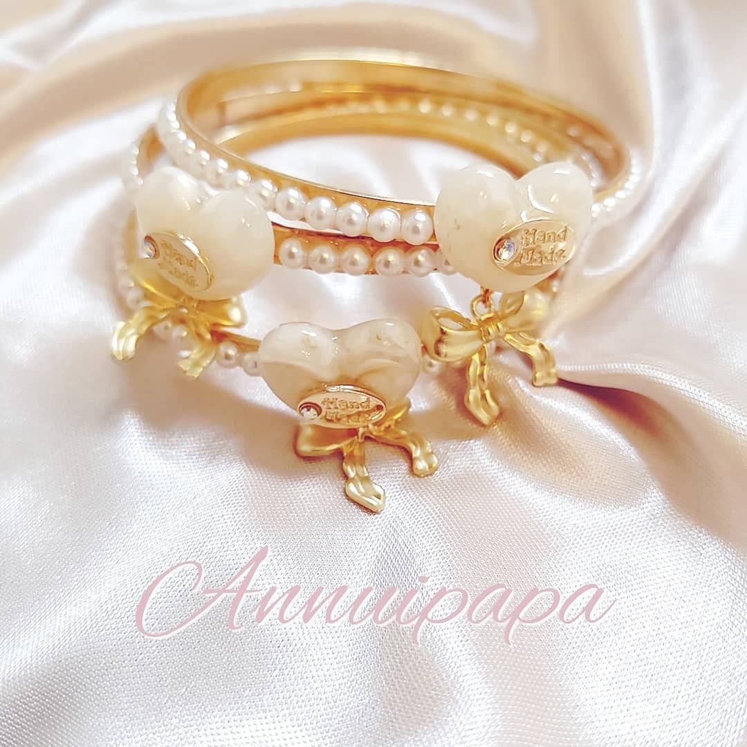 バングルは腕につけるものなのでこちらも大きめサイズです。今回のこのバングルはブレスレットとして手首につけるほうが可愛いデザインなので、シュシュや他のブレスレットと一緒につけることをおすすめいたします♡(他のブレスレットと一緒につけると腕のほうに移動しづらいのでおすすめです♡)
