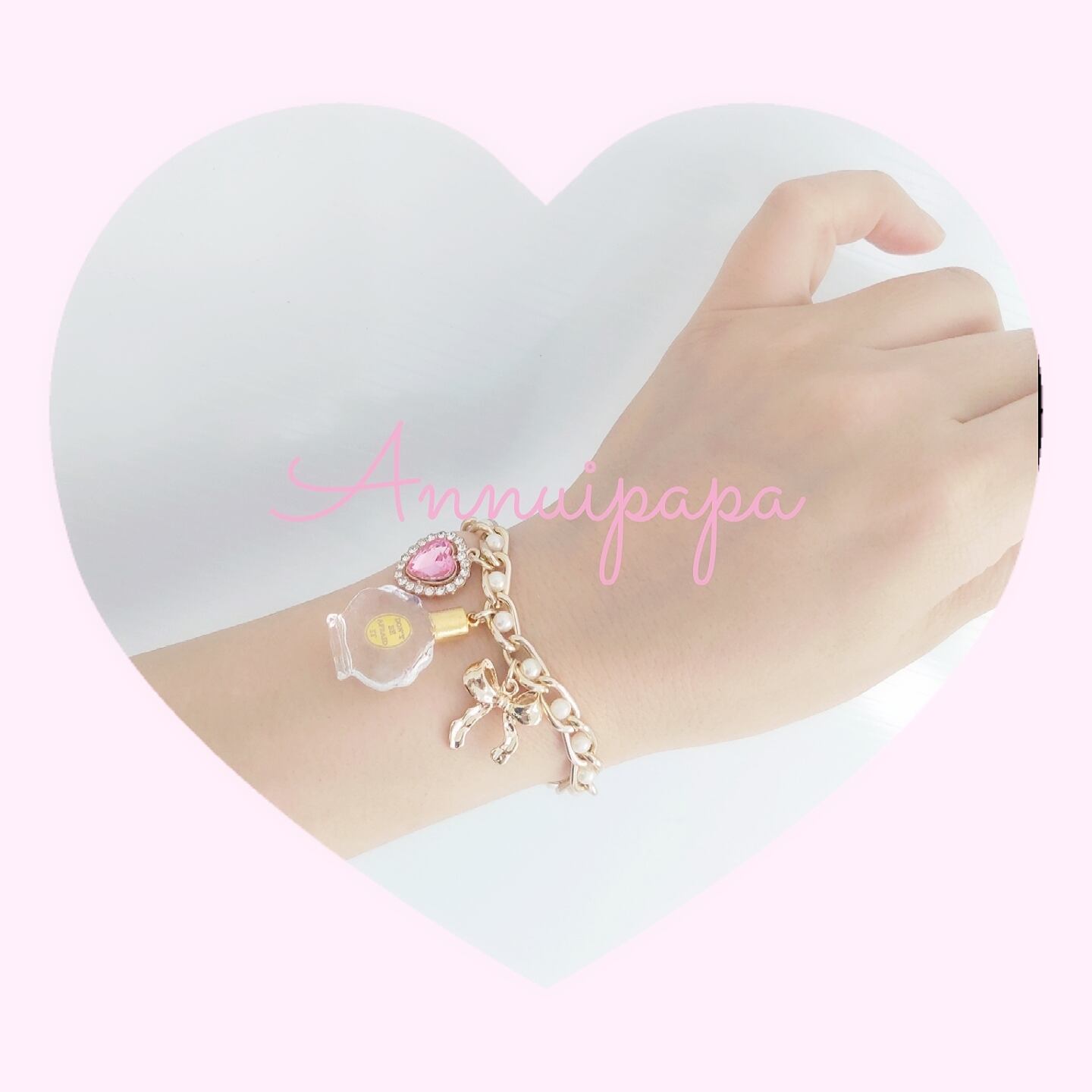 大人っぽい輝きが魅力のブレスレット。キラキラと輝くハートとパフュームボトルが、華やかで洗練された雰囲気を演出します。腕元を華やかに彩り、コーディネートのアクセントにぴったりです♡